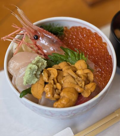 먼저 나온 카이센동을 보고 깜짝 놀랐습니다. 밥 위에 신선한 해산물이 빼곡하게 올라가 있더라고요. 우니, 연어알(이쿠라), 보탄새우, 관자(가리비), 광어, 연어가 한 그릇에 들어 있었어요. 여기서 이쿠라(いくら)란 연어알을 소금이나 간장에 절인 것을 말하는데, 일본에서는 초밥이나 덮밥의 필수 토핑으로 여겨집니다. 저는 젓가락으로 우니부터 떠먹었는데, "지금까지 제가 먹던 우니는 뭐였지?" 싶을 정도로 비린 맛이 전혀 없었어요. 크리미하면서도 바다향이 진하게 올라오는 게, 마치 해산물의 해상도가 480p에서 1080p로 업그레이드된 느낌이었습니다.