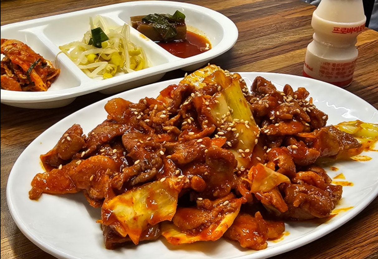 이곳의 가장 큰 매력은 단연 제육볶음 하나로 승부하는 심플한 메뉴판입니다. 고기는 얇게 썰어 불향 가득하게 볶아내고, 고추장 양념은 맵지 않지만 중독성 있는 감칠맛을 자랑합니다. 무엇보다 “밥도둑”이라는 말이 정확히 들어맞는 양념이 포인트로, 자취생이나 학식에 지친 대학생들이 정기적으로 찾게 되는 이유 중 하나입니다.